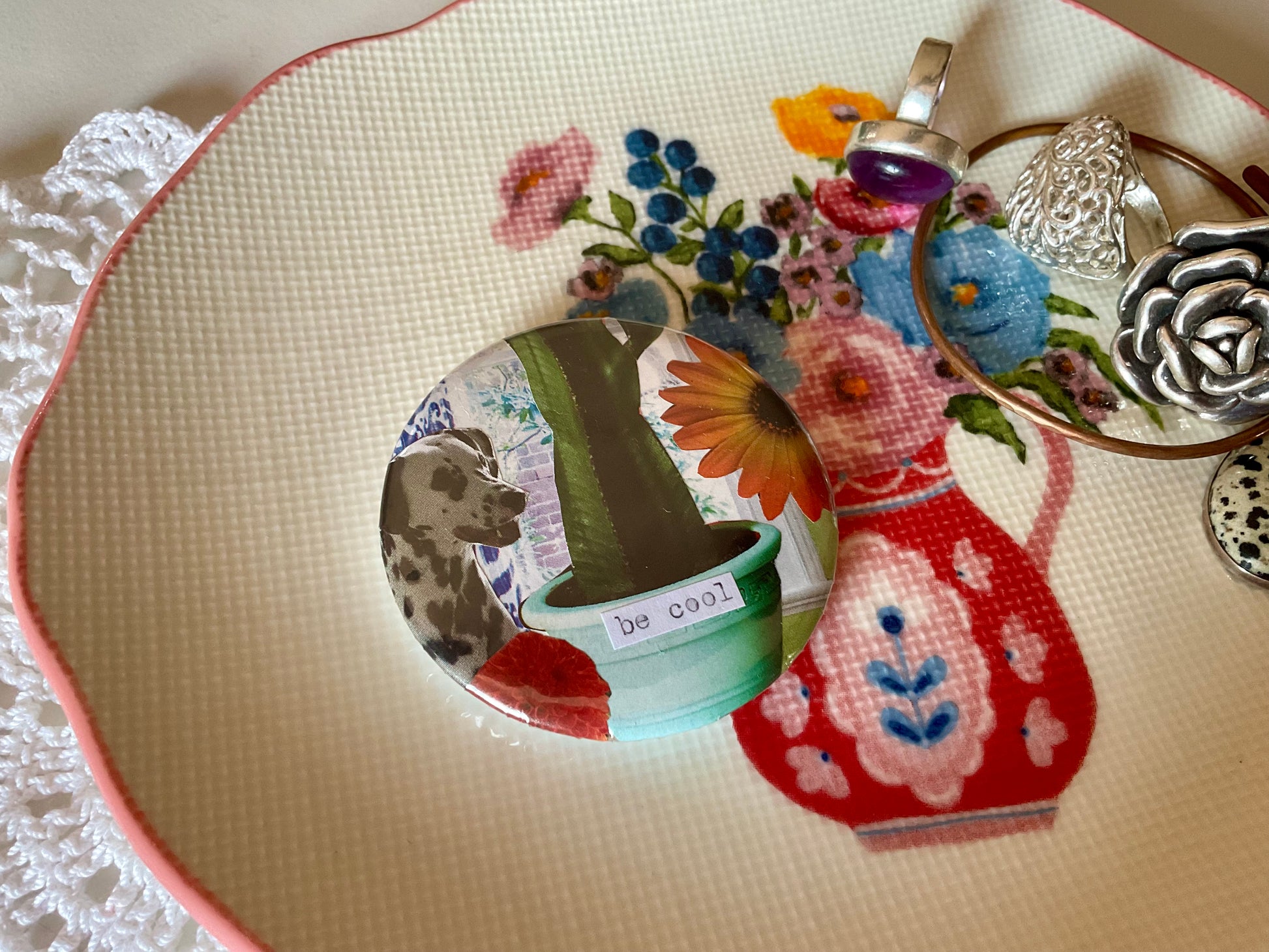 A cool Dalmatian unique collaged badge measuring 58mm or 2.25inch diameter