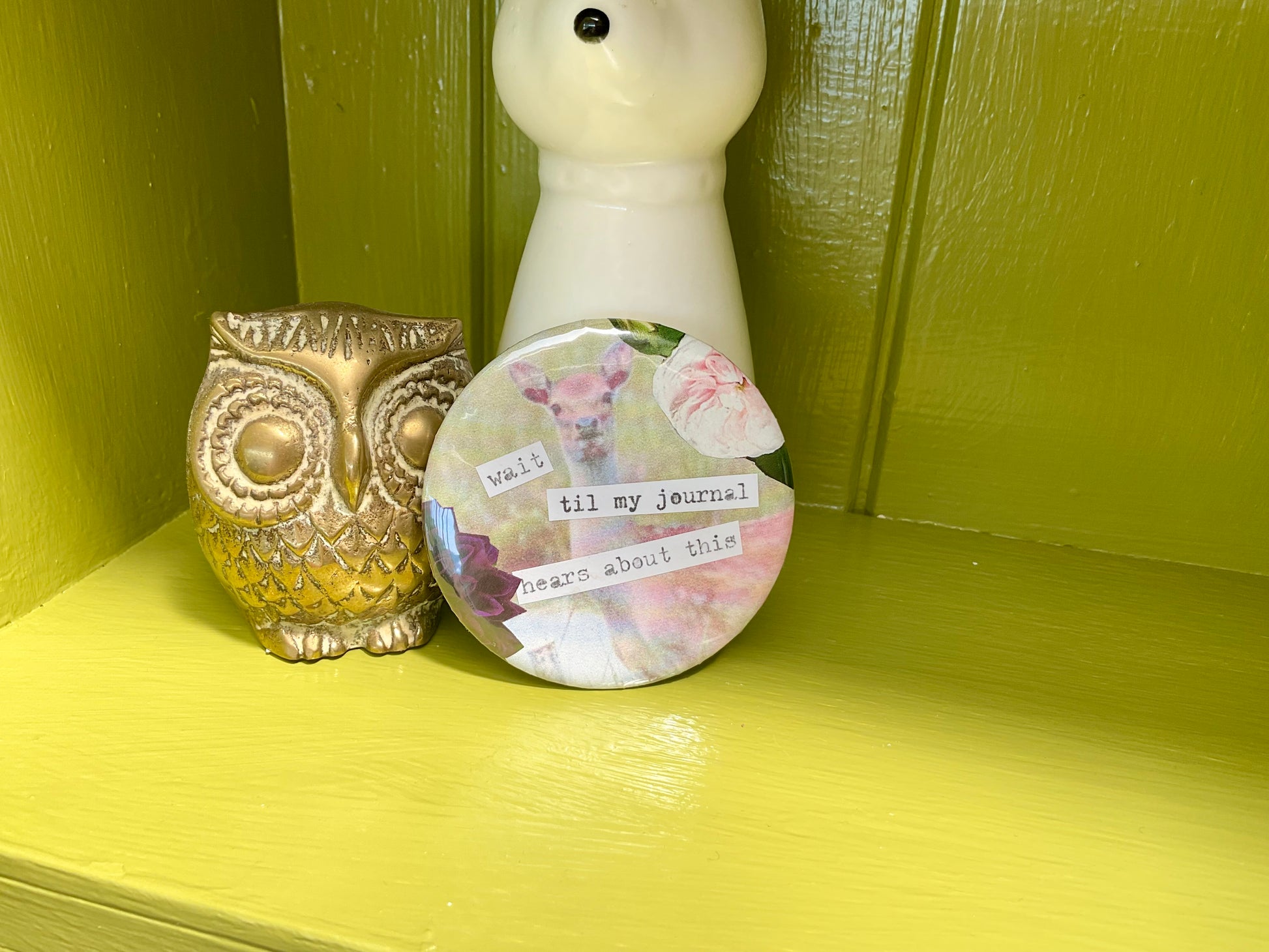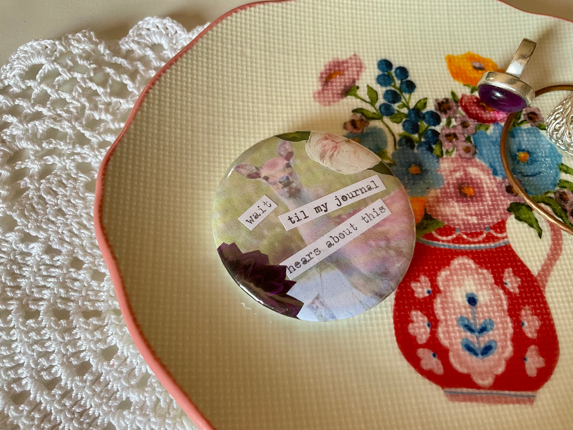 Journaling her feelings…unique collaged badge