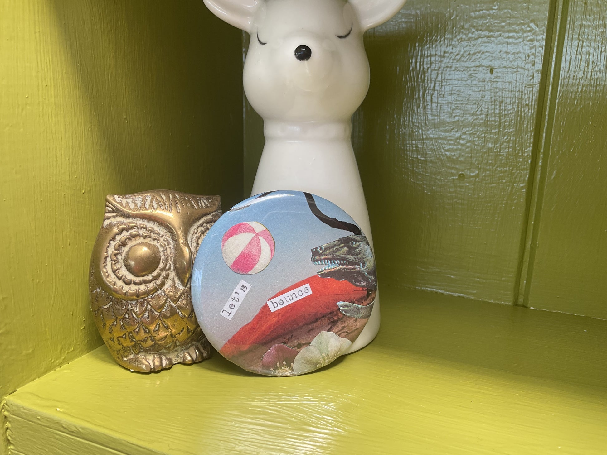 This rebel reptile is ready to bounce. Unique collaged design 2.25 inch diameter or 58mm, plastic backed pin badge as pictured. Free UK shipping