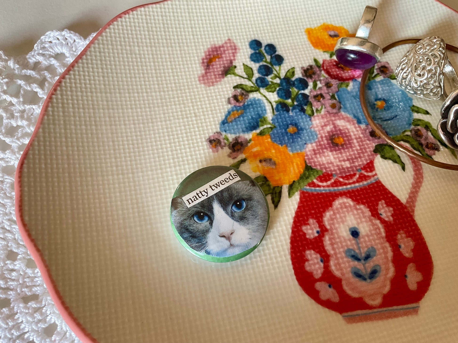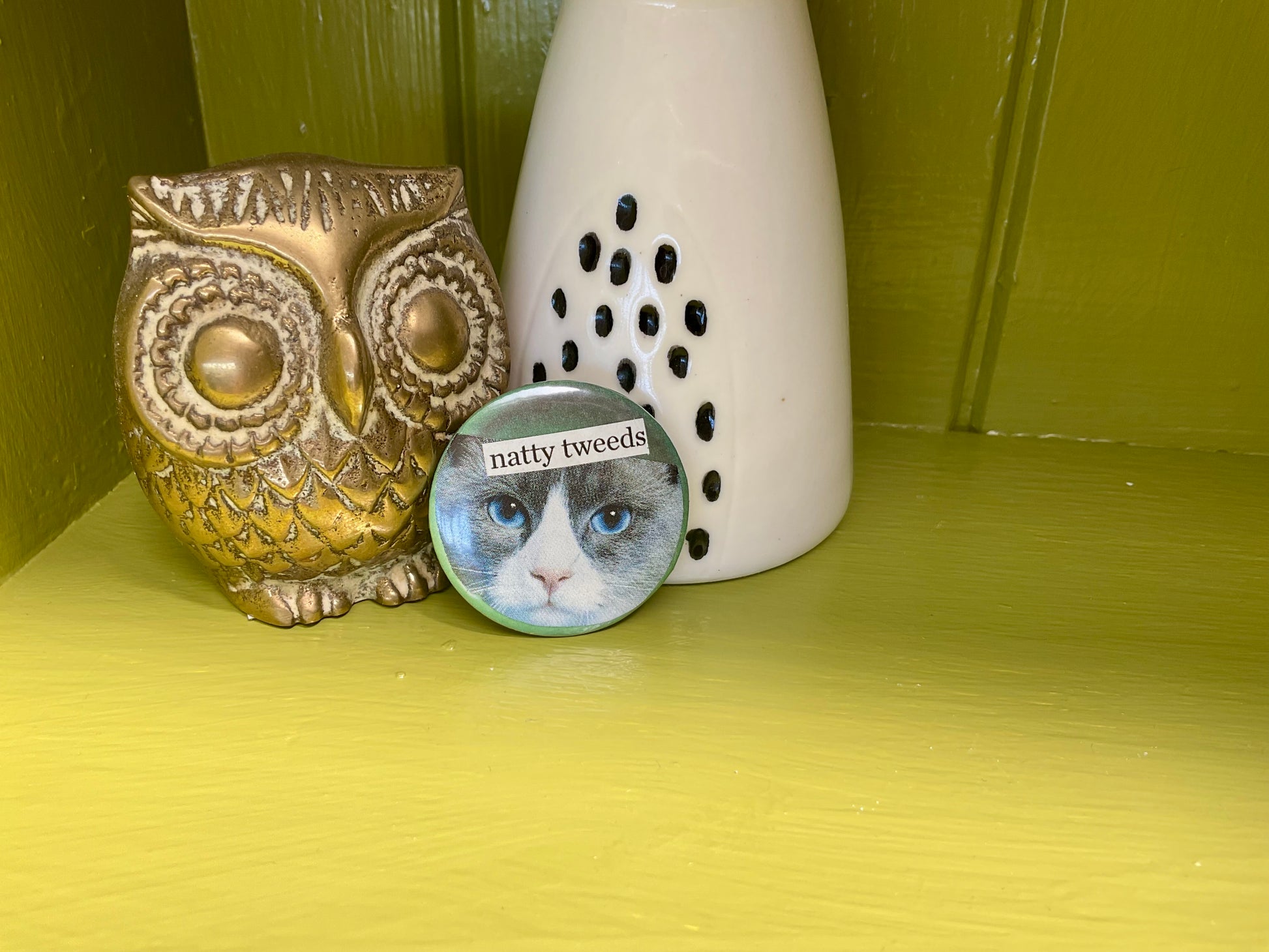 Stylish kitty in a 1.5 inch/3cm collaged badge