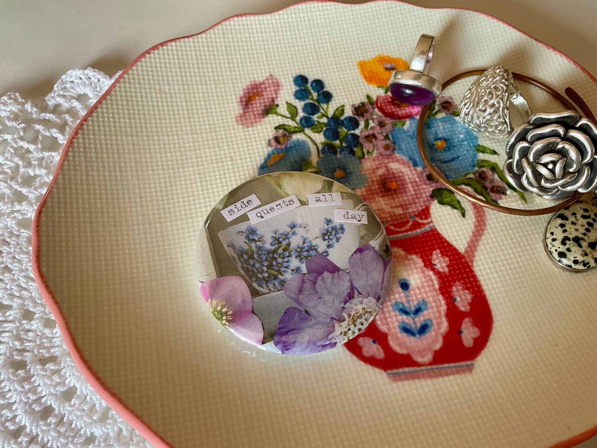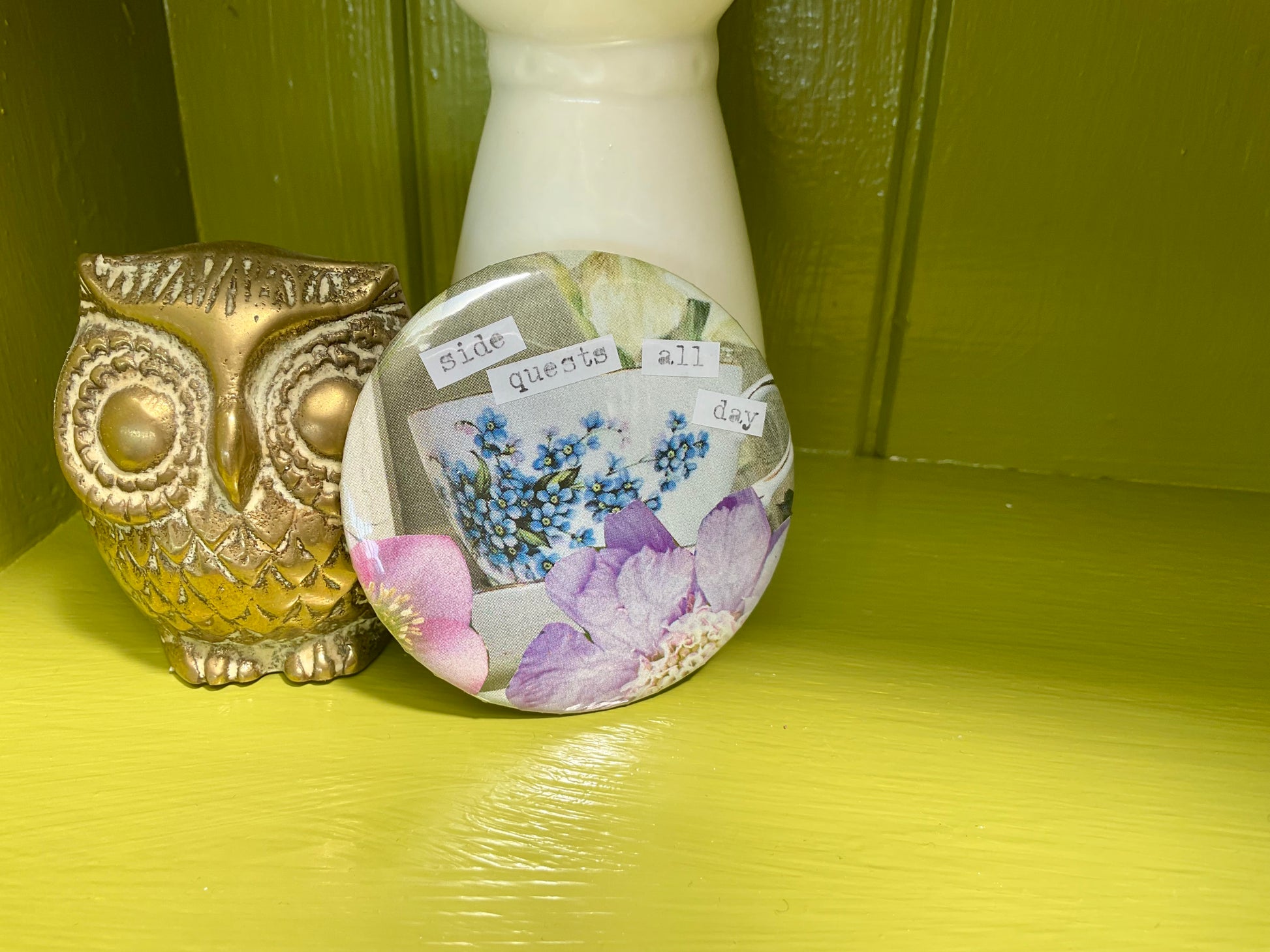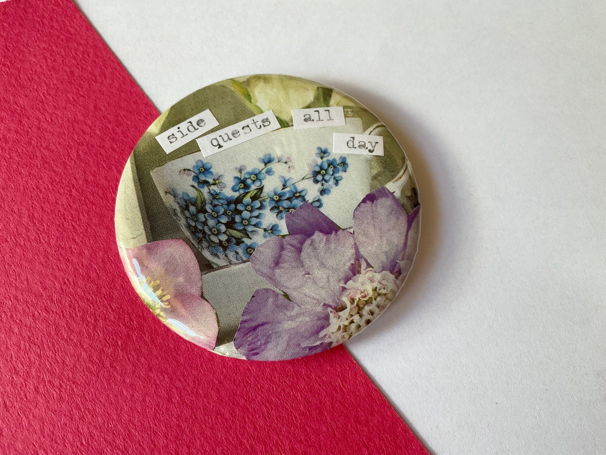 Tea and side quests…unique collaged badge measuring 58mm/2.25 inches in diameter