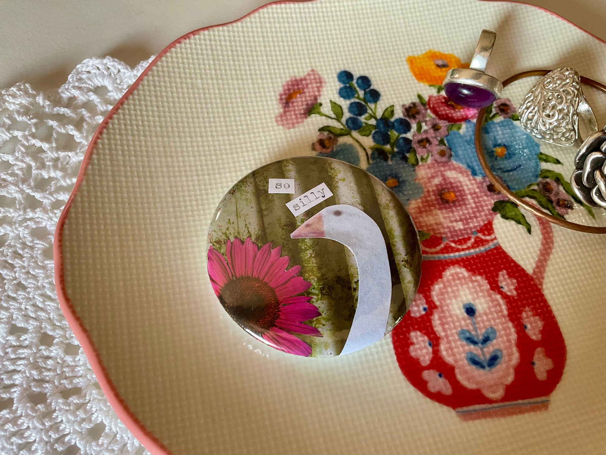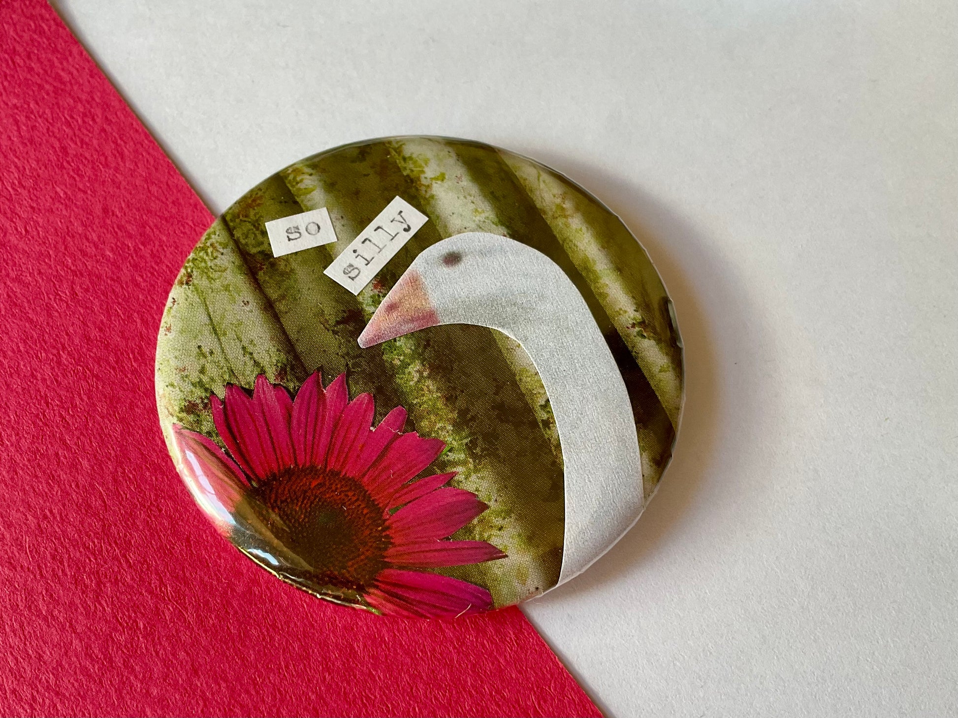Be so silly….unique collaged badge measuring 2.25 inch/58mm in diameter