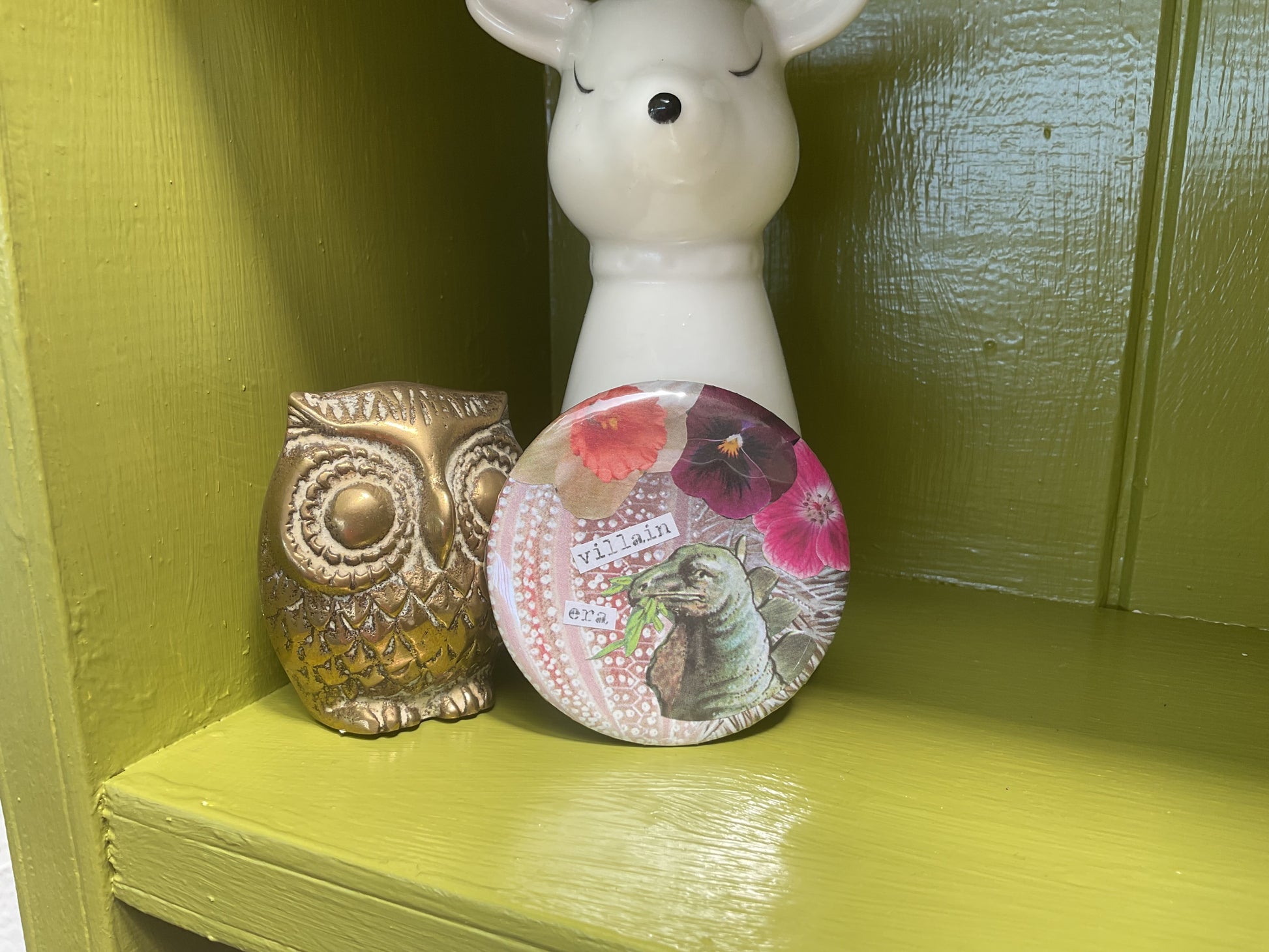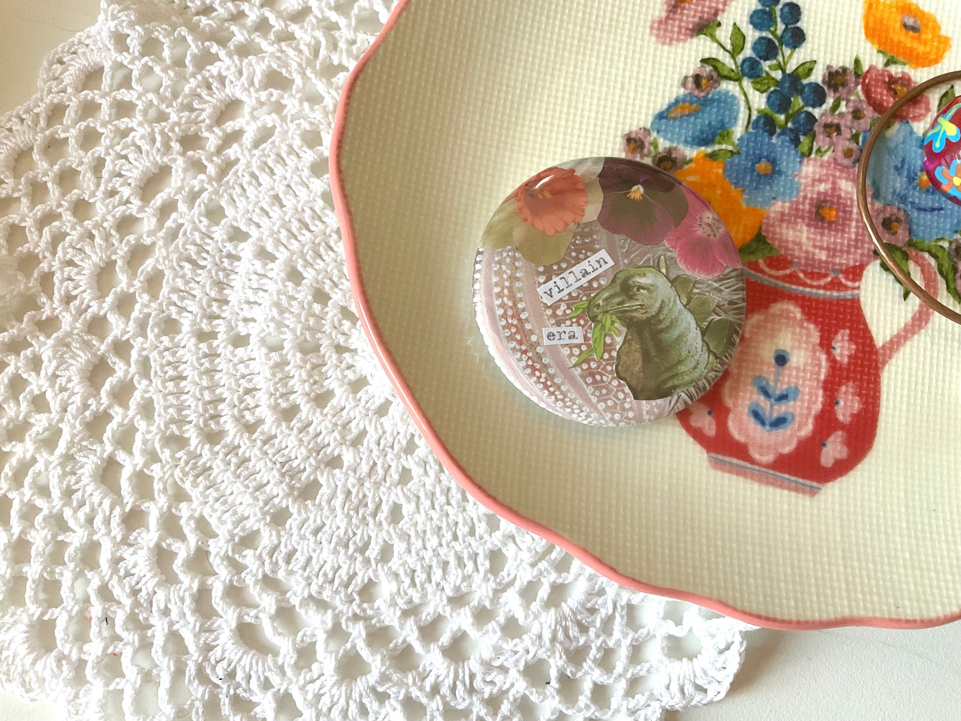 Let this plant munching baddie tell the world you take no nonsense. Unique collaged badge 58mm or 2.25 inch diameter